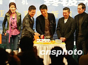 出席《無間道Ⅲ》北京記者見面會的黎明十二月八日切下生日蛋糕,接受朋友的祝福。中新社記者:鄭萍萍