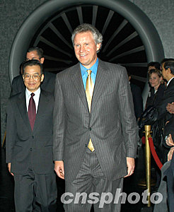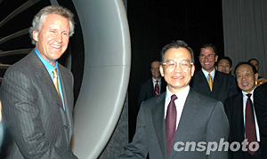 正在紐約訪問的中國總理溫家寶美東時(shí)間十二月八日下午,在美國通用電氣公司總裁兼首席執(zhí)行官伊梅爾特(右)陪同下,參觀美國通用電氣公司。中新社記者:趙海燕