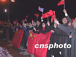 華盛頓僑胞機場熱烈歡迎溫家寶總理。中新社記者 余東暉 攝