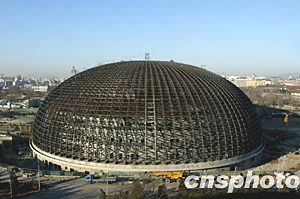 中國(guó)國(guó)家大劇院的鋼屋頂結(jié)構(gòu)日前全部完成。這只造價(jià)二十六點(diǎn)八八億人民幣的“巨蛋”將于二零零四年竣工,亮相于人民大會(huì)堂西側(cè)。中新社記者:毛建軍