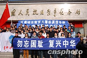 十二月十三日中午,一群臂纏黑紗、胸戴白花的年輕人拉起“勿忘國(guó)恥”的橫幅,在北京中華世紀(jì)壇附近紀(jì)念南京大屠殺六十六周年。這些年輕人通過互聯(lián)網(wǎng)自發(fā)組織在一起,他們中有公司職員也有大學(xué)生。圖為紀(jì)念活動(dòng)吸引大批市民。中新社記者 張煒