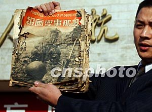 也在今天,幾本揭露當(dāng)年侵華日軍罪行的畫(huà)冊(cè)由溫州晚報(bào)社贈(zèng)送給抗戰(zhàn)紀(jì)念館。這家報(bào)社的編輯周麗峰介紹,這幾本發(fā)黃的《支那事變畫(huà)報(bào)》系日本朝日新聞社出版,今年十一月被溫州經(jīng)營(yíng)紙盒加工的企業(yè)從進(jìn)口的日本廢紙中發(fā)現(xiàn),畫(huà)冊(cè)中報(bào)道了一九三七年以后日軍在北平、天津、漢口、安慶等地的一系列軍事行動(dòng)。