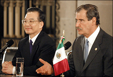會談開始前,?怂乖趪駥m中央庭院為溫家寶正式訪問墨西哥舉行歡迎儀式。在軍樂隊演奏了兩國國歌后,?怂怪略~熱烈歡迎溫家寶訪墨。他表示,溫總理首次出訪即選擇了墨西哥,表明兩國都期待著進(jìn)一步加強雙邊關(guān)系。中國在國際舞臺上作用日益重要,墨西哥愿與中國一道為共同營造更繁榮、更平等的世界而努力。溫家寶在答詞中表示期望通過訪問,與墨方增強互信、擴大共識、深化合作、共謀發(fā)展,使兩國友好合作關(guān)系進(jìn)入新的發(fā)展時期。隨后,兩國領(lǐng)導(dǎo)人檢閱了儀仗隊。溫家寶和福克斯還走到少年兒童歡迎隊伍中,慈愛地與他們擁抱和握手,引起孩子們的陣陣歡呼和掌聲。