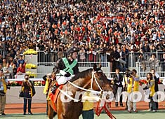 世界馬壇盛事──香港國際賽馬日十二月十四日在此間沙田馬場舉行,其包括香港杯、香港瓶、香港一哩錦標、香港短途錦標以及六場本地賽事,香港隊榮獲短途錦標和一哩錦標兩項桂冠。圖為香港“精英大師”獲短途錦標頭馬后,受到全場馬迷歡呼。中新社記者:潘索菲