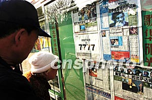 伊拉克前總統(tǒng)薩達(dá)姆被捕消息十二月十五日成為北京多家報(bào)紙的頭版頭條新聞,并以大篇幅予以報(bào)道。圖為北京市民在街頭《北京青年報(bào)》欄,逐條逐句認(rèn)真閱讀該項(xiàng)新聞。中新社記者:鄒憲