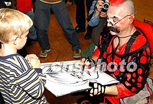 來自俄羅斯的莫斯科馬戲團(tuán)十二月十六日在香港舉行的演出發(fā)布會(huì),在香港一家商場里馬戲團(tuán)小丑為小朋友即興畫像。中新社記者:錢興強(qiáng)