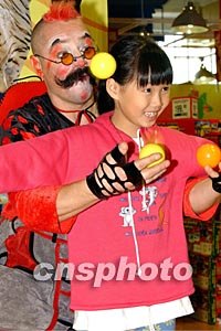 來自俄羅斯的莫斯科馬戲團(tuán)十二月十六日在香港舉行演出發(fā)布會(huì),該團(tuán)將在香港連續(xù)進(jìn)行為期數(shù)月的演出活動(dòng),全新的馬戲節(jié)目為香港觀眾帶來歡樂、刺激的新感受。圖為馬戲團(tuán)小丑指導(dǎo)小朋友練雜耍。中新社記者:錢興強(qiáng)