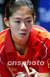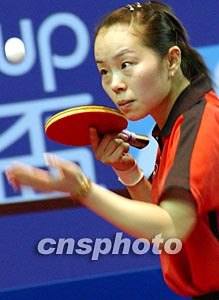 二零零三年女子世界杯乒乓球賽十二月十七日在香港舉行,中國參賽選手牛劍鋒在初賽上以4:0輕取日本選手梅村禮。中新社記者:錢興強(qiáng)