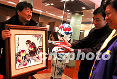 中國(guó)工藝美術(shù)師、陶瓷專(zhuān)家熊鋼如(左),十二月中旬在北京王府井景德鎮(zhèn)陶瓷城展示他的瓷畫(huà)“猴子與桃子”。隨著中國(guó)農(nóng)歷猴年的臨近,以猴為形象的工藝品與日俱增。中新社記者:王麗南