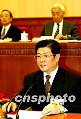 中共中央政治局委員王兆國(guó),二十二日在十屆全國(guó)人大常委會(huì)第六次會(huì)議上作中共中央關(guān)于修改憲法部分內(nèi)容建議的說(shuō)明。中新社記者:滿會(huì)喬