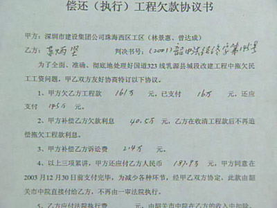 鄒遠貴:“我追了八年債,我沒回過家。沒辦法回去,1997年我父親去世了,我哭了10次!睋(jù)他們介紹,這條路是1994年3月上馬的,當(dāng)時乳源縣政府以招商引資的方式引來廣西梧州明興房地產(chǎn)開發(fā)公司、深圳建設(shè)集團公司珠海西區(qū)工區(qū),三方約定:工程總投資5800萬元,由甲方乳源縣政府以征地、拆遷等形式出資580萬元,乙方廣西梧州方出資1000萬元,丙方深圳珠海工區(qū)自籌其余工程款4220萬元,并以大包干的形式負責(zé)工程項目的全部施工建設(shè)。然而在實施過程中,資金卻出現(xiàn)了問題。