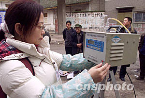 川東北氣礦“一二·二三”井噴特大事故封壓工作獲得成功后,工作人員立即進入受災(zāi)核心區(qū),清理現(xiàn)場的動物尸體,進行登記和銷毀工作。另外,由于核心區(qū)內(nèi)的空氣及水源水質(zhì)也受到不同程度的污染,環(huán)保部門也在進行水質(zhì)和大氣監(jiān)測。圖為環(huán)保工作人員正在對井噴事故發(fā)生地的空氣進行檢測。作者:周舸