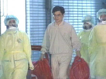 中新網(wǎng)12月30日電 據(jù)臺灣媒體報道,臺灣今年冬季首位感染SARS的詹姓中校,今天(30日)凌晨零時五十分許,在兩名身著隔離衣的護士陪同下,悄悄步出臺北和平醫(yī)院,隨后立即由家人駕車接離,結(jié)束其十三天的醫(yī)療。