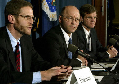 美國(guó)農(nóng)業(yè)部官員肯尼思·彼得森(左)29日在華盛頓的發(fā)布會(huì)上說(shuō),調(diào)查人員發(fā)現(xiàn)有問(wèn)題的牛肉已經(jīng)流入華盛頓州、俄勒岡州、加利福尼亞州、內(nèi)華達(dá)州、阿拉斯加州、夏威夷州、愛(ài)達(dá)荷州、蒙大拿州和關(guān)島的食品零售市場(chǎng)。美國(guó)食品和藥物管理局說(shuō),有關(guān)部門(mén)已經(jīng)下令在這些地區(qū)范圍內(nèi)回收總計(jì)4.5噸的牛肉。