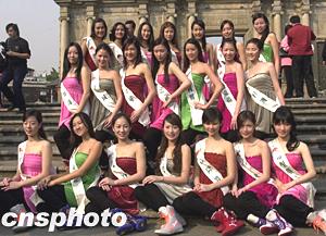 《2004年度國(guó)際華裔小姐競(jìng)選》二十一位候選佳麗三十一日到澳門作一天親善訪問,圖為佳麗們?cè)谑姓䦶d留影。作者:李剛