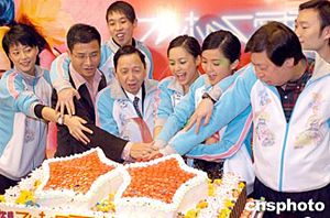 演唱會(huì)結(jié)束后,Twins與唱片公司高層吳雨及演唱會(huì)主辦機(jī)構(gòu)老板張耀榮等人舉行祝捷會(huì)切蛋糕。作者:鄧慶樂(lè)