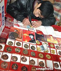 元旦期間湖南韶山的旅游商品攤點上,攤主忙著為游客在仿制的毛澤東像章上刻名留念。新年假期,參觀毛澤東故鄉(xiāng)的游客劇增。中新社記者:宋吉河