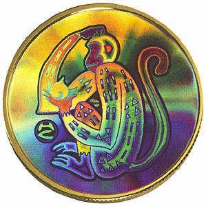 金幣18開(kāi)金,激光泛彩,幣面彩色全息圖像為左手托仙桃、右手頭部抓癢蹲姿側(cè)像,表現(xiàn)了猴俏喜活潑的可愛(ài)形象。