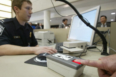 2004年1月5日,在洛杉磯國際機(jī)場,美國海關(guān)及邊境安全部門的官員展示新的指紋識別及拍照系統(tǒng)。從5日起,美國全境將推廣使用該系統(tǒng),對進(jìn)入美國的外國游客進(jìn)行身份識別。