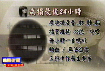 據(jù)TVBS報(bào)道,醫(yī)生表示,梅姑在世的最后一天終日迷迷糊糊,癌細(xì)胞已擴(kuò)散到骨肺肝及腦部等主要器官,靠?jī)x器維持心跳和呼吸,而且每小時(shí)打一次嗎啡。盡管養(yǎng)和醫(yī)院動(dòng)用3個(gè)專(zhuān)科10名醫(yī)生,還是沒(méi)能救回梅姑。