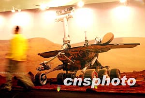 美國“勇氣”號機(jī)器人漫游者日前成功登陸火星后,北京一商廈適時展出相關(guān)照片,廣受市民歡迎。中新社記者:武仲林