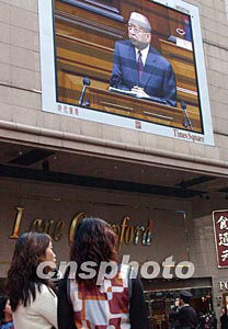 香港特別行政區(qū)行政長官董建華,元月七日在香港立法會上發(fā)表施政報(bào)告,在時(shí)代廣場許多市民通過電子顯示屏觀看立法會現(xiàn)場轉(zhuǎn)播實(shí)況。中新社記者:錢興強(qiáng)