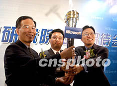 一月七日,三名微軟管理人員在北京交接火炬。微軟公司宣布,原微軟亞洲研究院院長(zhǎng)張亞勤博士(中)將升任微軟公司全球副總裁,調(diào)回微軟總部,負(fù)責(zé)微軟移動(dòng)通信及嵌入式系統(tǒng)在全球的開發(fā)業(yè)務(wù)。同時(shí)原微軟亞洲研究院副院長(zhǎng)沈向洋博士(右)晉升院長(zhǎng),原微軟亞洲研究院副院長(zhǎng)張宏江博士(左)被提升為新近成立的微軟亞洲工程院院長(zhǎng)。中新社記者:張宇
