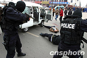 1分鐘后,2名劫匪挾持一儲(chǔ)戶,另2名劫匪持長(zhǎng)短槍掩護(hù)沖出營(yíng)業(yè)大廳,妄圖奪路而逃。防暴狙擊手將2名持槍劫匪當(dāng)場(chǎng)擊斃。另2名劫匪被迫退回營(yíng)業(yè)廳。參演民警隨即向大廳內(nèi)發(fā)射催淚彈,頭戴防毒面具的防暴警順勢(shì)沖入營(yíng)業(yè)大廳,將1名劫匪擊斃,另1名活捉。整個(gè)戰(zhàn)斗,歷時(shí)7分鐘。
