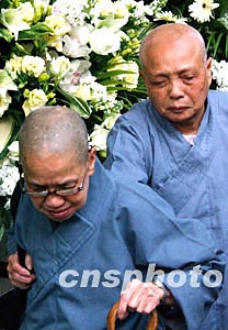 香港著名藝人梅艷芳喪禮于元月十一日設(shè)靈公祭,兩位法師來到香港殯儀館拜祭梅艷芳。中新社記者:錢興強