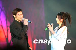 中國(guó)600多名藝術(shù)家十一日歡聚北京,在中國(guó)文聯(lián)舉辦的《百花迎春--中國(guó)文學(xué)藝術(shù)界2004春節(jié)大聯(lián)歡》上慶祝即將來(lái)臨的新春佳節(jié),演員趙薇、陸毅同臺(tái)演唱《好人好夢(mèng)》。中新社記者:王瑤