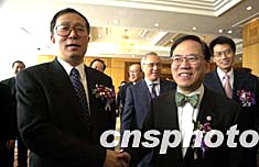一月十五日,香港地鐵有限公司投資深圳市軌道交通四號線原則性協(xié)議在深圳簽署。該線南起皇崗口岸北至龍華新城中心,總長二十一公里,總投資約人民幣六十億元,計劃二零零八年建成通車,建成后可與香港九廣鐵路落馬洲支線實現(xiàn)接駁。圖為香港政務(wù)司司長曾蔭權(quán)和深圳市代市長李鴻忠出席簽署儀式。作者:陳文