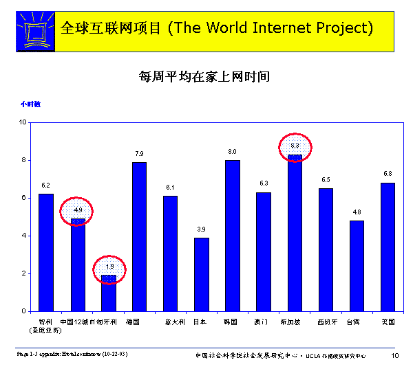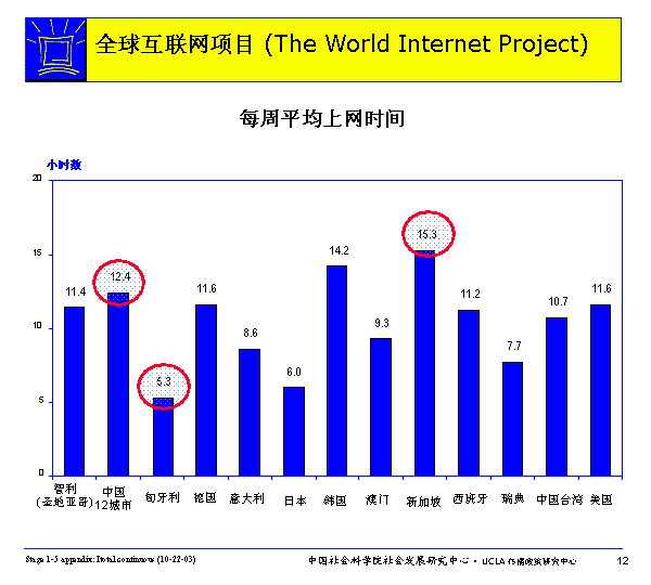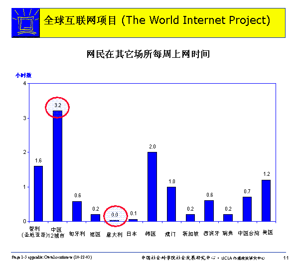 網(wǎng)民每周在家庭、辦公室或?qū)W校之外的場所(在發(fā)達(dá)國家,有可能是在圖書館,而一般國家則更可能是在網(wǎng)吧)上網(wǎng)的平均時間多者可達(dá)3.2小時(中國),少則幾乎為零(意大利)。
