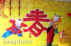 2004年1月14日,行人走過(guò)上海街頭一幅“喜娃報(bào)春”的年畫(huà)前。中國(guó)的傳統(tǒng)佳節(jié)——春節(jié)就要到來(lái),申城街頭隨處可見(jiàn)傳統(tǒng)的中國(guó)年畫(huà)。井韋 攝