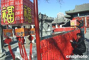 猴年春節(jié)在即,第三屆北京民俗文化節(jié)暨第六屆東岳廟文化廟會一月二十日即將在著名的東岳廟舉辦。十九日工作人員正在加緊布置“!甭罚酉楹团d旺的新春。中新社記者:張勤