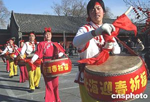 猴年臨近,來(lái)自河南新鄉(xiāng)王官營(yíng)風(fēng)雷盤(pán)鼓藝術(shù)團(tuán)的團(tuán)員們二十日在北京北海公園表演盤(pán)鼓,營(yíng)造熱烈的佳節(jié)氣氛。中新社記者:張勤