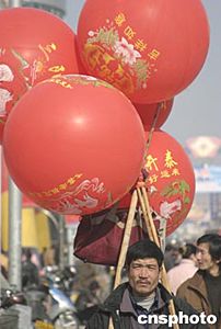 春節(jié)臨近,江蘇走街串巷的貨郎趁著年關(guān)人們購(gòu)置年貨的機(jī)會(huì),扛著高高的氣球穿行于街道,等待著買(mǎi)賣(mài)的到來(lái)。中新社記者:高遠(yuǎn)