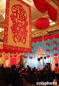 北京人民大會(huì)堂春節(jié)前夕舉行聯(lián)歡會(huì),明亮的大廳內(nèi)高懸福字,慶祝中國(guó)農(nóng)歷猴年的到來(lái)。中新社記者:毛建軍