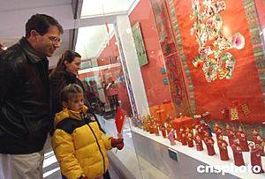 第三屆北京民俗文化節(jié)暨第六屆東岳文化廟會(huì)在北京古老的東岳廟舉行。其中民俗婚禮展廳展示的中國古代迎親儀仗隊(duì)伍的微縮景觀,吸引了一家在中國過春節(jié)的外國游客駐足觀看。中新社記者:張勤