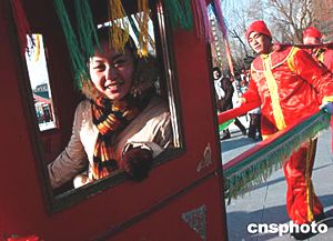 中國農(nóng)歷大年初一,北京各大公園別具特色的廟會(huì)活動(dòng)紅紅火火地開始了,大觀園內(nèi)仿照中國古代新娘出嫁坐花轎的游樂項(xiàng)目,引來許多平日坐慣轎車的現(xiàn)代女性,鉆進(jìn)花轎品嘗舊時(shí)“新娘”滋味。中新社記者:王麗南