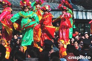 在北京大觀園廟會(huì)上,來自山西省大同地區(qū)民間特有的“撓擱”表演,吸引無數(shù)市民駐足觀看!皳蠑R”是在一個(gè)壯漢身上綁起一根兩米高的鐵桿,頂端安有鐵座,化了妝的男童或女童綁坐在上面,被稱作“撓擱人”。中新社記者:王麗南