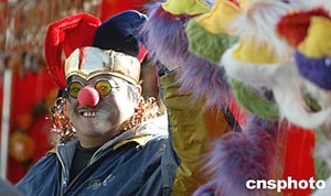 一名商販在剛剛開幕的北京龍?zhí)稄R會(huì)上推銷常見于西方節(jié)日的妝飾用品,給傳統(tǒng)的中國廟會(huì)增添新鮮色彩。中新社記者:毛建軍