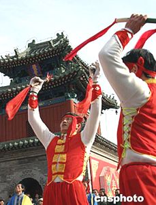 在東岳廟第三屆北京民俗文化節(jié)暨第六屆東岳文化廟會(huì)上,來自河南新鄉(xiāng)的農(nóng)民正在表演熱情奔放的乾坤大鼓,慶祝新春的到來。中新社記者:張勤