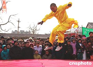 22日中國(guó)猴年第一天,北京新奧少林學(xué)校的學(xué)生在北京廠甸兒廟會(huì)上龍騰虎躍,出手不凡的少林武功令人大開眼界。中新社記者:鄒憲