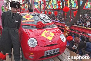 春節(jié)期間,北京民政局借白云觀廟會的旺盛人氣,恢復(fù)推出即開型實(shí)物彩票,大批逛廟會的市民爭相購買彩票,希望摸得汽車等大獎(jiǎng)。中新社記者:張煒