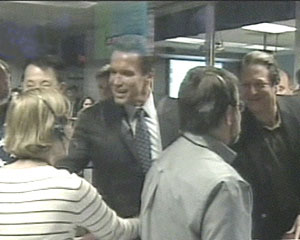 中新網(wǎng)1月25日電 據(jù)美國(guó)有線(xiàn)新聞網(wǎng)消息,美國(guó)加州州長(zhǎng)施瓦辛格在“機(jī)遇”號(hào)火星探測(cè)器成功登陸火星后,親臨指揮室向現(xiàn)場(chǎng)人員表示祝賀。