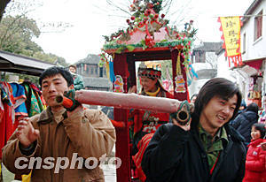 水鄉(xiāng)古鎮(zhèn)同里春節(jié)期間推出坐花轎過三橋活動,增加了節(jié)日氣氛,眾多游客興致勃勃地坐上了四人抬的大花轎,一邊傾聽著嗩吶等古樂的伴奏聲,一邊觀賞著水鄉(xiāng)古鎮(zhèn)的景色。作者:蔣振江