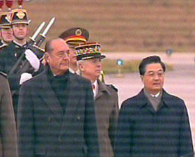 中國國家主席胡錦濤乘專機于巴黎時間下午兩點四十分抵達巴黎奧利機場,開始對法國進行國事訪問,法國總統(tǒng)希拉克夫婦親自到機場迎接。(電視截圖)