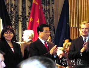 上午十一時(shí)半,在軍樂隊(duì)和儀仗隊(duì)的列隊(duì)引導(dǎo)下,胡錦濤主席健步邁入巴黎市政廳燈火輝煌的節(jié)日大廳,受到巴黎市官員、議員、各國(guó)駐法使節(jié)等一千多各界人士的鼓掌歡迎。