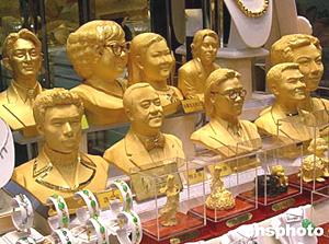 香港首飾店推銷有道,在商店櫥窗里擺出眾多香港明星造像,配以黃金首飾吸引游客觀賞購(gòu)物。作者:錢興強(qiáng)