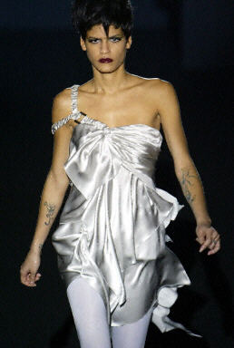 2月3日,在西班牙巴塞羅納時(shí)裝周上,模特展示了西班牙設(shè)計(jì)師Hannibal Laguna設(shè)計(jì)的性感露點(diǎn)裝。